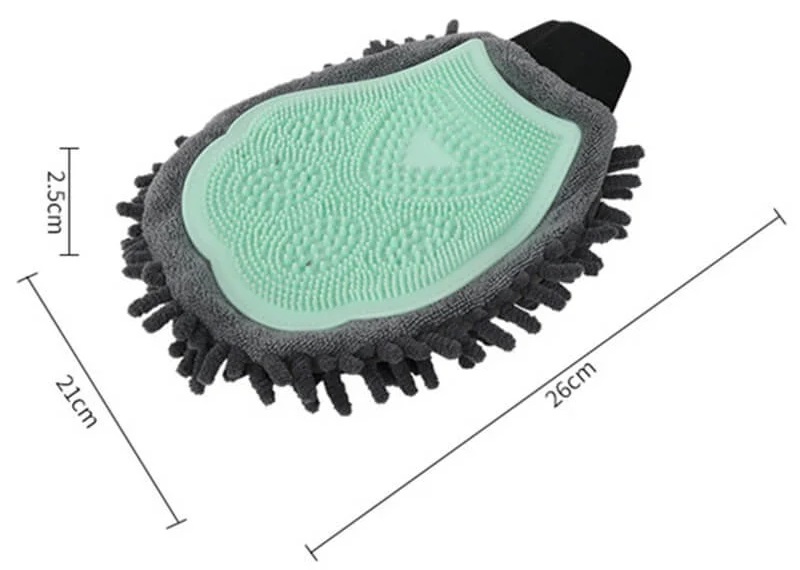 One side is equipped with a flexible silicone massage brush that effectively loosens dirt, removes loose fur, and stimulates the skin for a calming massage experience. Ideal for use during baths, it helps evenly distribute shampoo and reach difficult areas while keeping your hands clean and protected. The opposite side is made from ultra-absorbent chenille microfiber, which quickly soaks up excess water and wipes away remaining debris after washing.