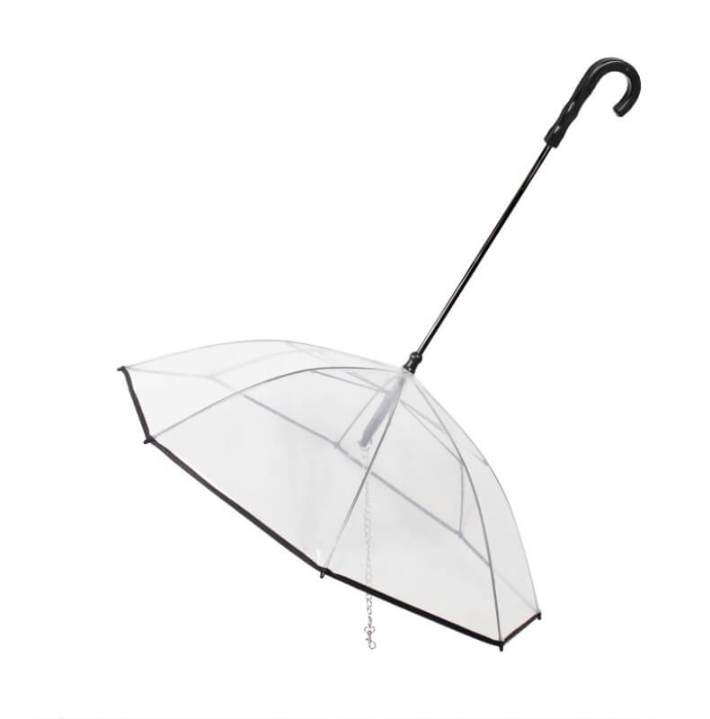 A transparent, lightweight dog umbrella with a secure traction chain, designed to keep your pet dry, calm, and comfortable during rainy walks.